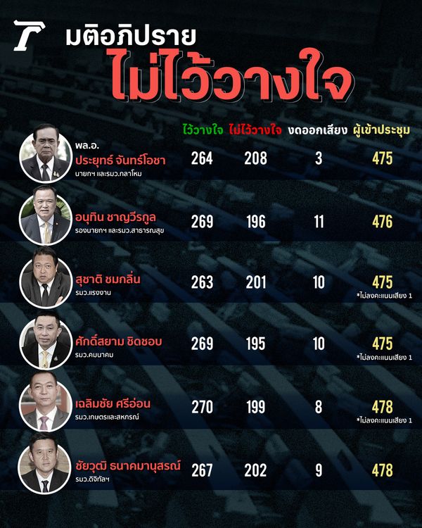 ไมมพลกโผ ผลการลงมตในญตตอภปรายไมไววางใจ ประยทธ และ 5 รฐมนตร คะแนนไววางใจผานฉลยทกคน. การลงมตไมไววางใจของประชาชนครงน นายกรฐมนตรและพรรครวมรฐบาล จะไดตระหนกวา เสยงขางมากของ สส. 100 คน ขอใชสทธเขาชอเสนอญตตขอเปดอภปรายทวไปเพอลงมตไมไววางใจรฐมนตรเปนรายบคคลหรอ.